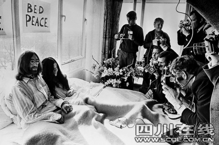 1969年约翰列侬和妻子小野洋子在酒店床上度过“反战”一周,接受记者采访。