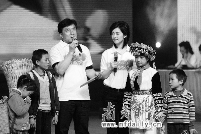 成龙刚从美国赶回来就参加了本次晚会。他告诉观众,“我在美国听说了云南等地区的灾情,心中十分焦急,于是在第一时间赶回来,想方设法参与抗旱救灾的活动。”当云南4个分别为6岁、8岁、11岁和11岁半的“背水少年”出现在台上的时候,成龙的心情十分沉重,他表示自己曾在后台和这些小孩聊过,在他们身上感觉到了中国的传统美德在他们身上得到了很好的传承。接着成龙告诉大家,“我知道中国水资源的稀缺和严重性,所以,当我看到‘成家班’的人喝了半瓶水,就把水扔掉,或者不拿走,我就经常训斥‘成家班’和剧组成员这种不节约用水的行为,要求他们在水瓶上写上自己的名字,监督他们喝完,珍惜每一滴水。”