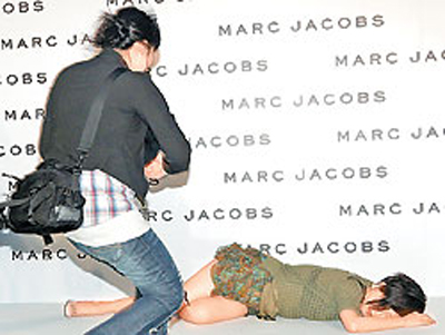 中新网4月6日电 徐若瑄上周参加美国设计师品牌MARC JACOBS春夏大秀,穿透视军装上衣秀黑色内衣,进场拍照没3分钟,就突然双腿瘫软在背板前晕倒,让现场媒体一脸错愕,工作人员也立刻冲上前准备急救,此时她却突然起身,大声笑说:“愚人节快乐!”原来大家都被整了。