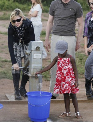麦当娜带着女儿Lourdes、养女梅西(Mercy)探访马拉维一个叫做 Millenium的贫困山村。麦当娜放下天后架子,亲自到庄稼地里用压水机压水,用双手刨地挖花生,体验穷生活毫无怨言。