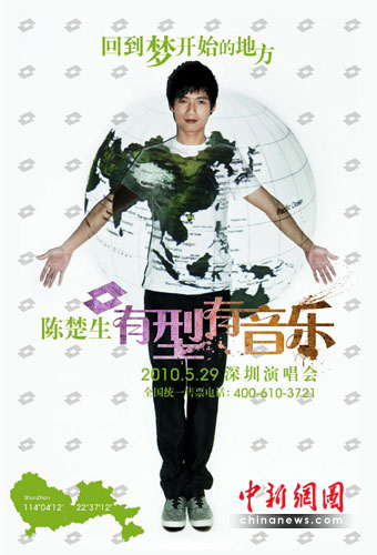 中新网4月20日电 日前,陈楚生深圳演唱会海报曝光。在最新曝光的演唱会海报中,陈楚生平躺在一个立体的地球图形上,胸前清晰的映衬出中国的版图。