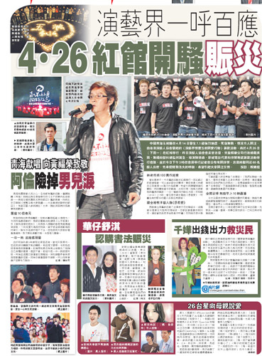 中新网4月21日电 据香港“明报”消息,中国青海玉树县在4月14日发生7.1级强烈地震,情况令港人关注。由香港演艺人协会发起的《演艺界情系玉树关爱行动》筹款活动,将于4月26日(下周一)在红馆举行。昨日演艺人协会会长曾志伟、英皇娱乐公司行政总裁吴雨、导演陈德森、等就筹款活动举行会议,并于今日下午3时在会展举行记者会公布有关详情,志伟将联同近60名艺人出席。