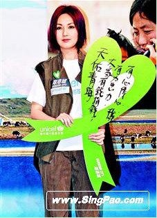 中新网4月21日电 杨千嬅昨日以联合国儿童基金香港委员会大使身份出席“青海青.心连心关爱暖青海筹款活动”,为青海地震筹款义卖绿丝带行动。