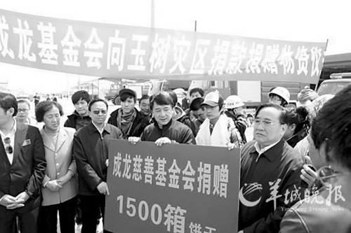 成龙:这次来玉树,基金会仅用了一天的时间,就从北京、上海、广州、郑州、浙江等多个地方筹集了15吨的货物,即便是包机仍然装不了,只能装三吨,今天过后,所有的援助物资会陆陆续续运过来。每天都知道这边需要很多很多物资,但我相信我们国家很有能力去救助……在这里我要感谢我的朋友们,你们都献出了自己的一片爱心……现在我还身在结古镇,请大家放心,你们的心意、你们的祝福我都会一一替你们带到的!希望能有更多的人来关注灾区,有钱的出钱,有力的出力,一起帮助我们的家人渡过难关!
