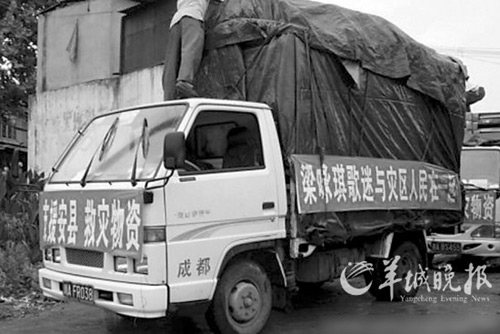 梁咏琪捐献的救灾物资运到灾区