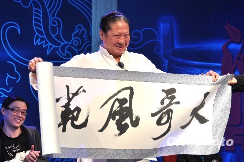 22日,《叶问2》在北京举行全球首映礼发布会,洪金宝被赠“大哥风范”书法作品。中新社发 李学仕 摄