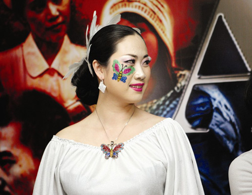 头上插满白色羽毛,右脸上是一只艳丽的蝴蝶,左腿部是一朵娇艳的芙蓉花,白丝质超短裙配大红高跟鞋……为配合转型后的“清纯”路线,芙蓉昨日的造型也“冰清玉洁”。