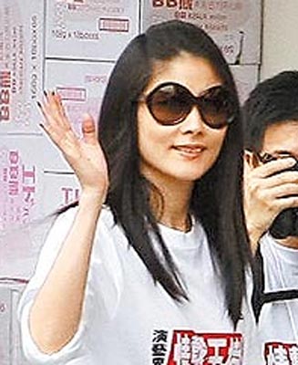 陈慧琳昨戴墨镜、穿活动T恤出席拜神仪式,结束后露出笑容向媒体招手。