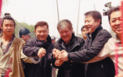有赵本山的地方,必然会有爆笑声,这个定律在昨日的无锡影视城里,再次得到了验证。昨日,本山传媒进军电影圈的首部大戏《大笑江湖》在无锡影视基地正式开机拍摄,除了赵本山和小沈阳、程野以师徒档携手出现,出品方博纳影业的老总于冬和导演朱延平、武术指导程小东也齐齐登场,独缺剧中女主角林熙蕾没有现身。