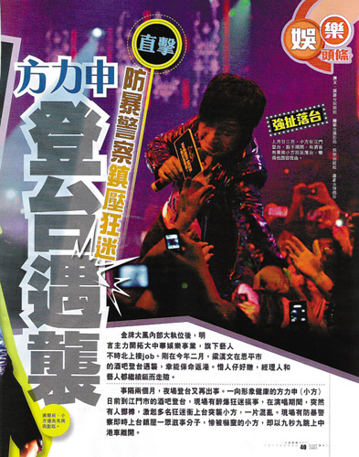 据悉,向来走健康路线的方力申,一直都抗拒到夜店登台。但在过去一年,由于“金牌大风”内部人事变动,黄柏高失势,部分艺人如杨爱瑾、傅颖等都先后离巢,旗下艺人的工作量也越来越少。无奈之下,方力申见侧田、邓丽欣等都纷纷北上登台捞金,才终于破例下海接酒吧秀。据知情人士透露:“登台的明星一般都很懂得保护自己,之前就会跟酒吧讲好条件:一定要有中港直通车即日来回,起码十个保安,不陪喝不陪唱不陪吃,只跟观众握手合照但一定不下台,而且一唱完立刻走,不在当地住酒店过夜。”