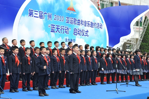 “蓝天行动”由广州亚组委、广州华美英语实验学校以及北京成龙慈善基金会共同主办。活动现场,华美英语实验学校的100名学生深情朗诵《蓝天》歌词。该校师生发起了向青海玉树地震灾区捐款活动,并把募集的10多万善款交给北京成龙慈善基会,向灾区人民送去孩子们的祝福和问候。