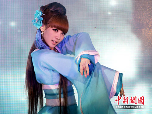 中新网5月19日电 性感女主播柳岩18日在杭州身穿古装“穿越”登场,为网游《仙途》代言,她轻歌曼舞展现不同以往的古典气质,更与《仙途》掌门人史玉柱的合影的过程中,幽默调侃对方“不要离我那么远,我又不是老虎。”引起现场笑声连连。