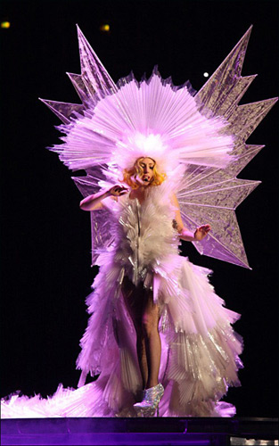 当晚Gaga装扮依然是前卫另类,展示了带铆钉的黑皮三点式热辣舞衣配渔网袜,顶着丝线飘飘的大斗篷,戴着夸张的白色“扇子帽”。此外还在手上、胸部涂满红色涂料“鲜血淋漓”,和同样装扮的舞群一块热舞,被猛男贴身并抱入怀中。当晚Gaga的姿势也非常大胆豪放,时而劈腿时而俯身让臀部来个特写。