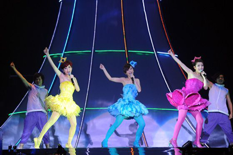 在一万两千名歌迷坐无虚席的热情欢呼声中,S.H.E着“银河女王装”从六层楼高的舞台主景──“花冠宝座”中绽放登场,高唱“Super Star”揭开演唱会序幕。随后脱掉外套,以一连串high翻天的性感舞曲为演唱会带起第一波高潮。