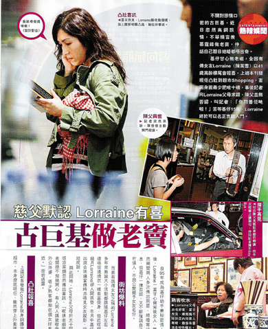 自1995年成为古巨基的助手兼秘密情人后,Lorraine一直甘心做其背后的女人。虽然其间两人多次传出同居、结婚的消息,但古巨基一概否认。素有“跟得女友”之称的Lorraine,多年来无论大小活动都跟随古巨基左右,但近几个月,她却像“人间蒸发”,古巨基出席宣传活动时竟不见其踪影。与此同时,Lorraine的父母开的凉茶铺忽然传出喜讯。“这阵子老板和老板娘不知多开心,因为就快做外公外婆了!不少熟客都知道他们的女儿好事近。”街坊透露。