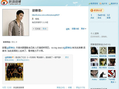 虽然刘嘉玲的页面除了问候语和头像之外空无一物,但截至昨天记者发稿时,她的粉丝数量已经达到20755人,且还在不断上升。可不要小看这个数字,点击量排行稳坐冠军的“微博女王”姚晨开博数月,粉丝也不过一千多人。而刘嘉玲那八个字的问候语,也得到了1004个回复,其中,示爱的、赞其“高贵”的、表示支持的占了九成。