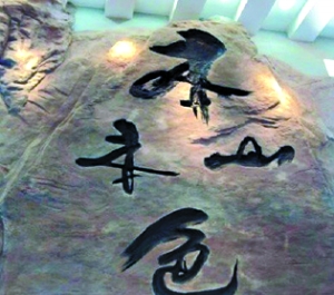 图为本山传媒办公楼内刻有“本山本色”的假山石