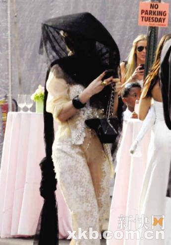此次,LadyGaga一改往日乱涂乱抹的雷人妆容,身穿坠珠蕾丝衣裤,隐隐露出皮肤。而头上则戴了超大黑色斗笠,帽子前面的黑色垂下将脸遮住,似是怕人认出。而身后还有黑色纱质披风一直垂到地上,更雷人的是,披风打了一个很大的结,似超长马尾辫。而脚上穿的鞋子因为裤子太长遮掩而无法清晰辨认,但是从造型来看,颇似清代女子穿的“花盆底”,不过天才的雷后加以改动,鞋底更高更厚,夸张至极。不知Gaga此举是否是怕人认出,只是如此行动,欲盖弥彰。