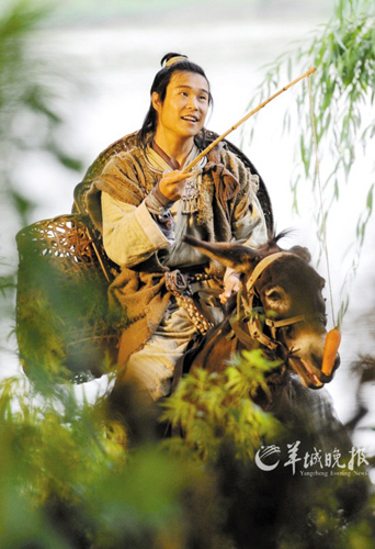 当天的拍摄地点是在横店附近的一个竹林里,风景怡人。记者一到场,就看到穿着麻布衣服的小沈阳拿着一根钓着萝卜的钓竿,用萝卜引着一头驴往前走。小沈阳脸上一副洋洋得意的表情,那头驴也很抢镜,盯着萝卜的眼神让人忍俊不禁。