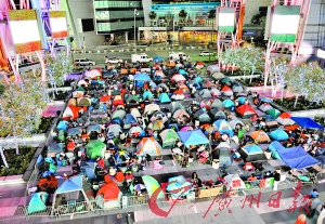 数以百计的影迷早在21日已来到剧院外通宵扎营“霸位”,更在帐篷外大贴三位主角的海报,务求能跟偶像近距离会面,场面十分火爆。提前到场的影迷多数在20岁左右,他们有的支起帐篷,有的放下躺椅,耐心等待着最激动人心的时刻到来。