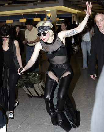 中新网6月24日电 据英国《每日邮报》消息,昨天,百变天后Lady Gaga穿超高高跟鞋抵达英国机场,结果雷人装扮害了自己,刚出机场就重心不稳当场重摔在地,当众出糗,要由助手扶起才能起身。