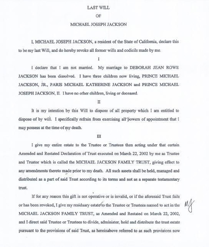 杰克逊猝死后,遗嘱和财产问题一直扑朔迷离。后经媒体披露,杰克逊曾于2002年7月订立遗嘱,他在这份遗嘱中声明,他的全部财产(当时估计超过五亿美元)交付“迈克尔•杰克逊家庭信托基金”,并指定他的母亲凯瑟琳•杰克逊和三名子女为遗产受益人。迈克尔的父亲乔•杰克逊不在受益人名单中。杰克逊在遗嘱中特意强调:前妻黛博拉•罗不能继承任何遗产。