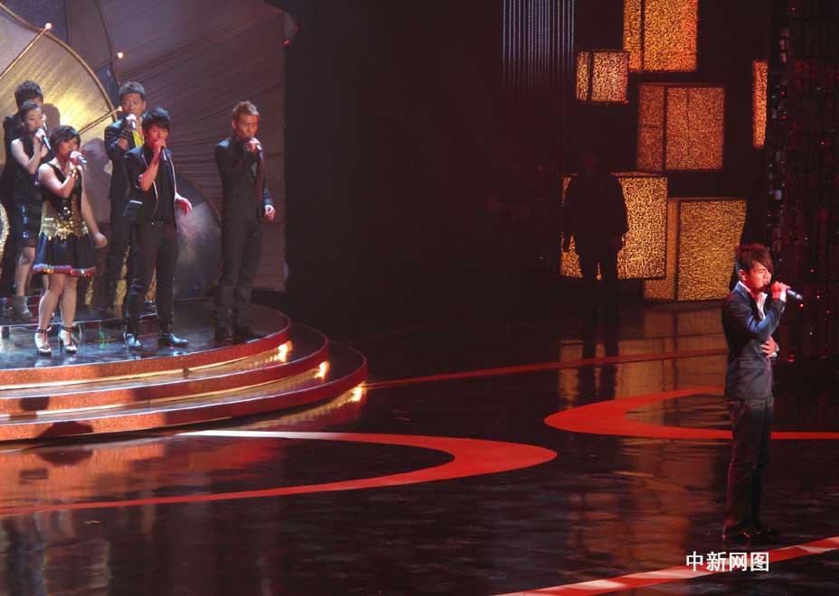 图为台湾人气歌手曹格率领香港歌唱选秀节目《超级巨星》的参赛者表演歌曲联唱,为港姐决赛助兴。(摄影:余瑞东)