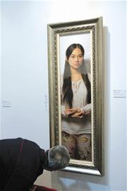 图为:逼真如照片的冷军油画,总能引来好奇的观众。