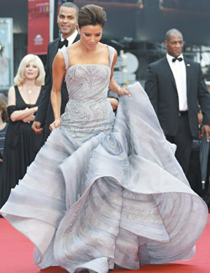 中新网5月18日电 据台湾媒体报道,前晚戛纳影展接连2部竞赛片首映,打头阵的是澳洲女导演珍康萍的“闪亮之星”,“主妇”伊娃·隆格莉亚和球星老公帕克亲密现身,两人在红地毯上大秀甜蜜。伊娃的花瓣礼服裙摆大得惊人,飘来荡去,颇有顺便打扫地毯的效果。