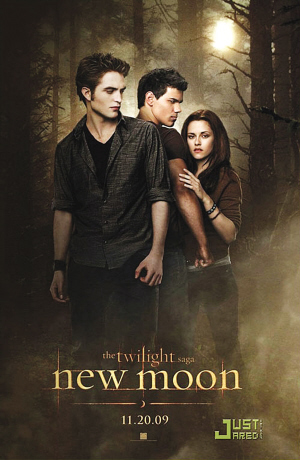 吸血鬼卖座大片《暮光之城》的续集《暮光之城:新月》(New Moon),近日曝光了首张海报——男女主角罗伯特·帕廷森、克丽斯汀·斯图尔特以及泰勒·洛特纳(Taylor Lautner)全部亮相海报。这一海报同时也暗示了三人在片中的关系——罗伯特·帕廷森和泰勒·洛特纳各自的群落属于敌对状态,但两人都与斯图尔特有着微妙的感情。该片将于今年11月正式公映。
