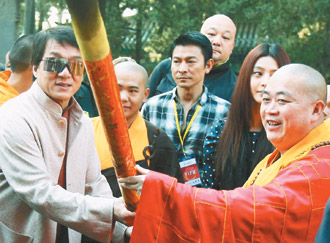 中新网10月23日电 刘德华将在新片《新少林寺》中拜成龙为师学功夫!昨天河南少林寺的宁静被打破,宣扬武术精神的《新少林寺》开镜,成龙、刘德华、谢霆锋、范冰冰、吴京齐聚少林寺,现场贵宾、武校学生见到巨星全变粉丝,拚命围上前来,场面一度失控,成龙则发挥大哥本色指挥现场,呼吁大家维持秩序。