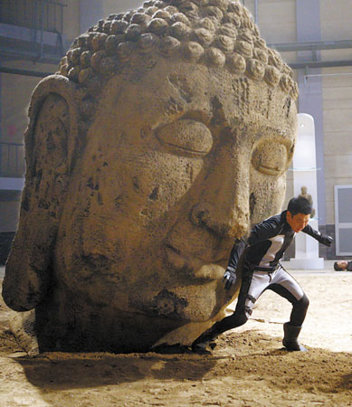 在《未来警察》中,刘德华化身为正义的未来警察,跟大S、范冰冰、徐娇、樊少皇、贺军翔共同上演了一出时空穿梭、正邪激战的火爆好戏。片中有一幕,拍的是刘德华站在一尊两米高的石佛之下,与樊少皇率领的改造人团伙激烈打斗。据了解,一贯追求完美的刘德华当时坚持不用替身,结果意外发生了。虽然已事先备下保护措施,但在推动佛像的过程中,这座千余斤的巨物却突然失控,将刘德华压在下面。现场工作人员大惊失色,一拥而上解救他,但画面也因此穿帮。 (李丽)