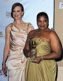 虽然妮可·基德曼近年来屡屡被冠以“票房毒药”的恶名,但她从来都是各大颁奖礼上的耀眼之星。妮可穿了一身单肩小花白色长裙,左胸下有发散出来的垂褶。她是颁奖礼上第一个上台颁奖的嘉宾。虽然妮可的白色单肩礼裙很美,但她一上台就为自己没穿黑色裙装向海地地震的死难者默哀表示歉意,并且宣传了网络捐款渠道和乔治·克鲁尼最近发起的捐款行动。