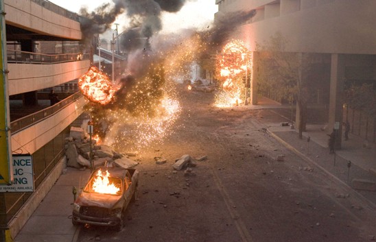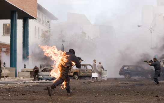 在电影《天地逃生》中,这种拍摄方式,发挥了神奇效果。影片本身是一个枪战片,但又不等同于一般的枪战,是以一种游戏的方式进行呈现的。导演所要传达给观众的是一种枪战游戏,本身就是一种虚拟现实,真真假假,虚实难辨,这种情况下,片段化、节奏感强烈的画面转接,反而成为了影片的一个优势,在视觉上,给观众带来了一种全新的体验。可以说,MV导演的特长,在日益新颖的题材中得到了更好的发挥。