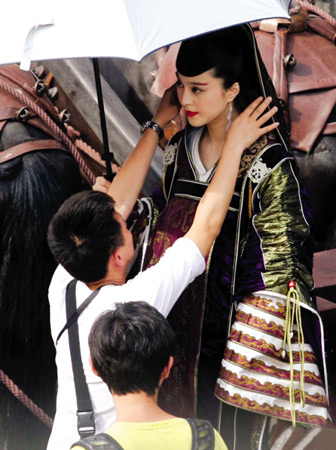 陈凯歌新片《赵氏孤儿》正在宁波赶拍,范冰冰的孕妇造型日前浮出水面。当天正在拍摄一场赵朔携庄姬进城见晋王的戏份。范冰冰扮演的庄姬华服绫罗地端坐在马车内,黑纱遮面,被赵文卓紧紧牵着。庄姬是“赵氏孤儿”赵武的生母,也是片中分量最重的女性角色。导演一喊卡,立即有三四个助手冲上去搀扶范冰冰下车,范冰冰以腹部高耸的造型亮相。虽然范冰冰早前在《苹果》中也扮演过孕妇角色,不过像这样夸张的“十月临盆”的大肚造型还是比较罕见的。(辛文)