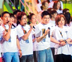 张学友与好友哈林合唱〈想念你〉和〈但愿人长久〉,昨一直未表态是否出席的黎明,稍晚出现并致词盼台湾民众“平平安安”,是唯一没有表演的天王。