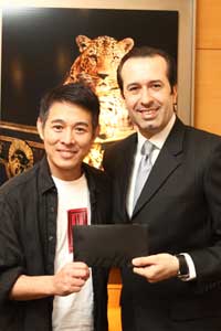 李连杰昨亮相品牌店名店2小时,并从品牌店的新加坡及马来西亚董事总经理Christopher Kilaniotis手中接过支票;据悉,Cartier在本地共筹得3万新元善款,马来西亚则筹得3万马币(约1万2200新元),整数4万2200新元支票昨交给李连杰。