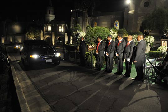 扶灵者是迈克尔的几位哥哥。他们全都穿着同一款式的黑色西装,以及只戴一只白手套,向他们心爱的弟弟道别。