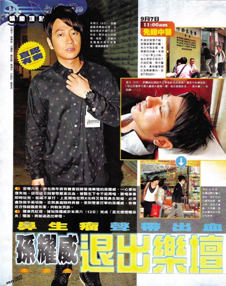 苦等六年,终在两年前有机会回归香港乐坛的孙耀威,一心要收复失地,却在近日因声带严重出血,被医生下令不能再唱。祸不单行,上星期他在照X光时又发现鼻生粉瘤,必须尽快做手术切除,否则可能导致鼻瘤异变。医生提议他放弃唱歌,否则有永久失声的危险。为了让声带休息,他本周六将坚持上星光熠熠辉保良慈善演出,此后便会宣布退出乐坛。