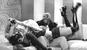 上周六播出最新一集SNL,年过半百的娜姐跟比她年轻一半的Lady Gaga,两人穿着皮制内衣及长靴劲歌热舞,娜姐先是挑衅地说:“跳得什么烂鬼迪斯科啊。”Lady Gaga回嘴:“麦当娜,我比你更辣。”娜姐不甘示弱地说:“我比你高,Lady Gaga这什么名字啊,听起来像婴儿食品。”随后两人扭打,主持人凯南·汤普森唯有出来调停,最后Lady Gaga干脆整个人飞扑过去,跨过凯南直接打娜姐。凯南正在发愁之际,两位“疯后”突然和好了,而且还当众亲嘴。事后两人表示互相当对方为偶像,感情好得很。泰渔