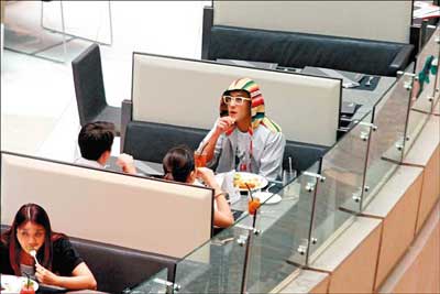 台湾媒体消息,日前,陈冠希约了两位外籍好友到人流极多的香港中环置地广场露天茶座喝下午茶,不知是没脸见人,还是真的患上人群恐惧症,当天他穿了一件连帽外套,将外套的帽子盖过大半个头,还戴了一副米白色的粗框大眼镜,他刚坐下就忙着把电话伸到桌底,神神秘秘地传简讯。起初他跟两位朋友还有说有笑,但眼看客人渐多,开始不自觉地用手遮住半边脸,鬼鬼祟祟的模样令人发笑。