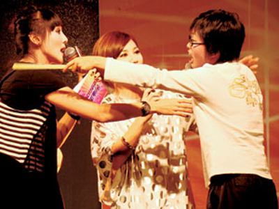 昨天,歌迷热情过度导致冲突,歌手梁静茹台上忙劝架。