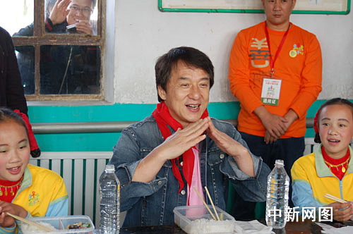 临近午饭时分,成龙与十几名小学童每人领到了一盒香菇炒油菜和白米饭的盒饭,在一间简陋的教室里津津有味地吃了起来。虽然是头一次与国际巨星成龙在一起吃饭,可这些乡村娃娃却一点也不怯场,好奇心驱使他们左一个问题右一个问题问个不完。而成龙却面带笑容地边吃边聊,将他的成长经历和成功经验耐心地一一解答。众学童听完后,纷纷夸“成龙叔叔好棒啊!”
