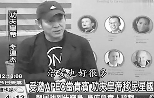 “功夫皇帝”李连杰移民新加坡一直是“公开的秘密”,日前他受邀以中小企业代表身份参加在新加坡举行的APEC会议。当时主持人问他现在移民新加坡了,对新加坡有何看法,李连杰表示,相比其他城市,新加坡干净很多,治安好很多,天气也热很多。同时他还透露,办壹基金是靠妻子利智给钱。