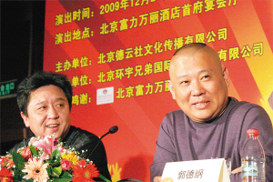 日前,“2009郭德纲圣诞喜乐会”发布会在北京举行。郭德纲今年选择了富力万丽酒店,将在可容纳1000人的宴会大厅里说相声。对于最高8800元、最低1800元的高价票设定是否合理,郭德纲直言真正的“纲丝”10万元也舍得花,这说明相声市场繁荣了。