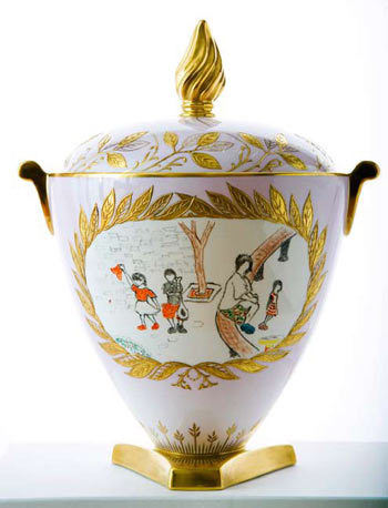 李亚鹏在2009年度嫣然天使基金慈善晚宴新闻发布会上表示,晚宴现场拍卖所需的艺术品已基本到位。其中,最吸引眼球的拍品无疑就是由两位“潜力艺术家”窦靖童、李嫣联手设计的Wedgwood-Trophy Vase(玮致活—胜利之瓶)精致骨瓷。据悉,Wedgwood是英国传统陶器品牌,窦靖童、李嫣为Trophy Vase所创作的这一设计,取材于一家人融洽相处的画面,表现出小孩眼中的温馨家庭氛围和每个人都渴望得到的关爱。