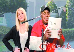 在一则小品中,布雷克装扮成“虎嫂”艾琳,逼着搭档基南·汤普森扮演的伍兹公开道歉,后者拿着印有“老婆太厉害了,我错了,我害怕极了”之类字眼的纸板不停道歉,令人忍俊不禁。