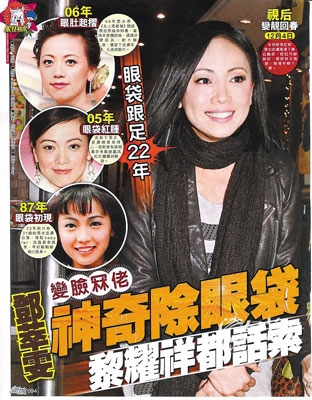 新晋“视后”邓萃雯最近被香港媒体盯上,不仅和“视帝”黎耀祥传出绯闻,日前又被某杂志爆出她做了切除眼袋手术,极速“变脸”成功。对此,邓萃雯解释这是做面膜达到的美容效果。香港女星“变脸”现象颇为普遍,谢安琪、郭可盈、郑裕玲等人都被媒体质疑做过整形手术,但几乎无一人承认。