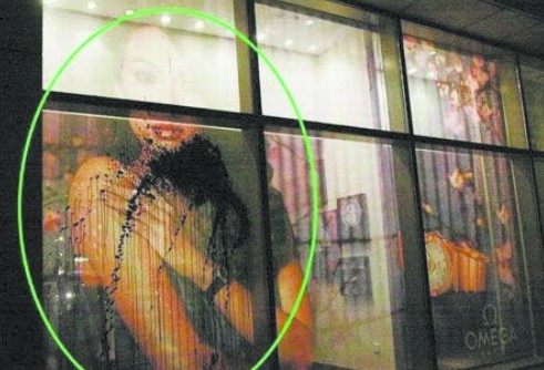 过了大概半个小时的样子,这辆车又开到了酒店门前,车上下来了两个用帽子遮着脸的男子,他们手里拿着墨汁,走到酒店东侧一间铂金店的门前,对着橱窗里的章子怡代言海报,将墨汁泼了上去,然后撒腿跑上了车。之后,这辆车拉着警报飞快离开了酒店,门前的记者和保安都被这一幕弄得有点莫名其妙。