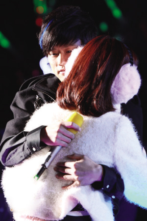 张杰与谢娜的恋情从2007年延续至去年,其间话题始终不断,就在两个月前,两个人还传出了分手的消息,但到了跨年演唱会当晚,人们看到的依然是一如既往的甜蜜画面:在演唱会的舞台上,张杰深情地看着谢娜,还没开始唱歌,谢娜的眼泪就已流了下来,接下来,张杰更现场改掉了《何必在一起》的歌词,两个人一起唱出了“我们要在一起”,当张杰拥抱住已经哭成泪人的谢娜时,场面被渲染得如偶像剧一般浪漫感人,粉丝更是尖叫连连。